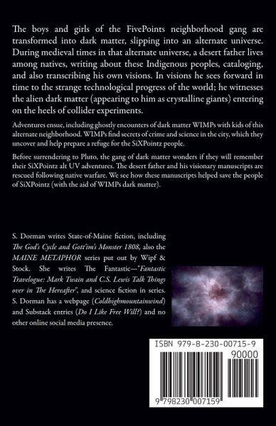 The boys and girls of the FivePoints neighborhood gang are transformed into dark matter, slipping into an alternate universe. During medieval times in that alternate universe, a desert father lives among natives, writing about these natives, cataloging, and also transcribing his own visions. In visions he sees forward in time to the strange technological progress of the world, and witnesses the alien dark matter (appearing to him as crystalline giants) entering on the heels of experiments. Adventures ensue, including ghostly encounters of dark matter with kids of the alternate neighborhood. They find secrets of crime and science in the city, which they help to uncover. At story's end the devastating secret of nuclear attack comes forth but the alternate neighborhood SiXPointz people have a refuge prepared. Having spent some time wondering if they would remember their adventures, the dark matter goes into nuclear destruction -- returning to their home universe and bodies. Back in time, the desert father and his visionary manuscripts are rescued following native warfare. It's shown how these manuscripts helped save the people of SiXPointz (with the aid of alien dark matter), and shown also how they were to make refuge outside the city.