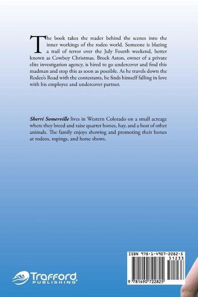 The book takes the reader behind the scenes into the inner workings of the rodeo world. Someone is blazing a trail of terror over the July Fourth weekend, better known as Cowboy Christmas. Brock Aston, owner of a private elite investigation agency, is hired to go undercover and find this madman and stop this as soon as possible. As he travels down the Rodeo's Road with the contestants, he finds himself falling in love with his employee and undercover partner.