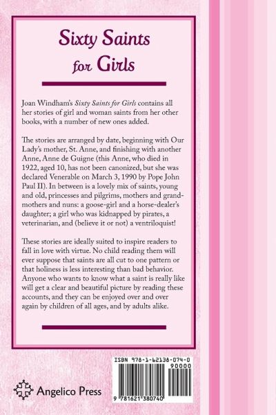 Joan Windham's Sixty Saints for Girls contains all her stories of girl and woman saints from her other books, with a number of new ones added. The stores are arranged by date, beginning with Our Lady's mother, St. Anne, and finishing with another Anne, Anne de Guigne (this Anne, who died in 1922, aged 10, has not been canonized, but she was declared Venerable on March 3, 1990 by Pope John Paul II). In between is a lovely mix of saints, young and old, princesses and pilgrims, mothers and grandmothers and nuns: a goose-girl and a horse-dealer's daughter; a girl who was kidnapped by pirates, a veterinarian, and (believe it or not) a ventriloquist! These stories are ideally suited to inspire readers to fall in love with virtue. No child reading them will ever suppose that saints are all cut to one pattern or that holiness is less interesting than bad behavior. Anyone who wants to know what a saint is really like will get a clear and beautiful picture by reading these accounts, and they can be enjoyed over and over again by children of all ages, and by adults alike.