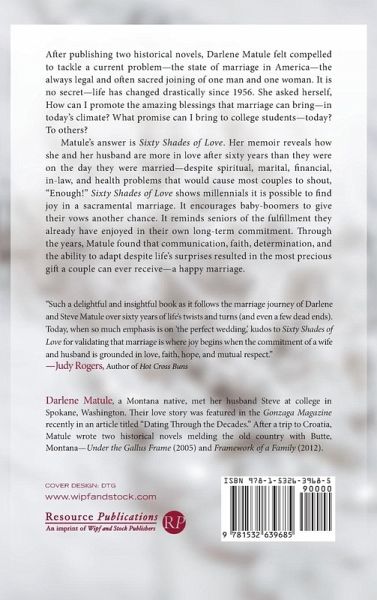 After publishing two historical novels, Darlene Matule felt compelled to tackle a current problem--the state of marriage in America--the always legal and often sacred joining of one man and one woman. It is no secret--life has changed drastically since 1956. She asked herself, How can I promote the amazing blessings that marriage can bring--in today's climate? What promise can I bring to college students--today? To others? Matule's answer is Sixty Shades of Love. Her memoir reveals how she and her husband are more in love after sixty years than they were on the day they were married--despite spiritual, marital, financial, in-law, and health problems that would cause most couples to shout, ""Enough!"" Sixty Shades of Love shows millennials it is possible to find joy in a sacramental marriage. It encourages baby-boomers to give their vows another chance. It reminds seniors of the fulfillment they already have enjoyed in their own long-term commitment. Through the years, Matule found that communication, faith, determination, and the ability to adapt despite life's surprises resulted in the most precious gift a couple can ever receive--a happy marriage.