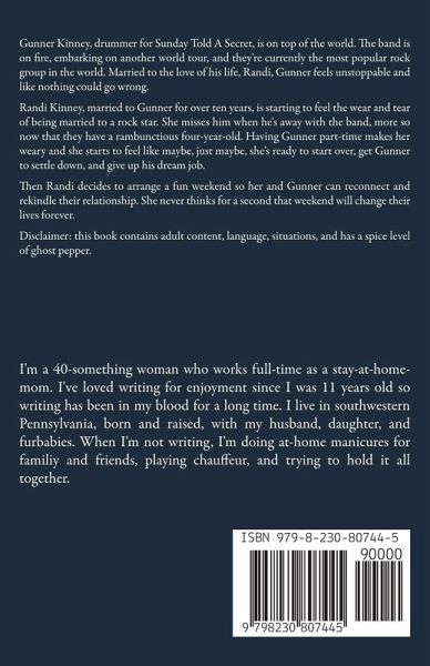 Gunner Kinney, drummer for Sunday Told A Secret, is on top of the world. The band is on fire, embarking on another world tour, and they're currently the most popular rock group in the world. Married to the love of his life, Randi, Gunner feels unstoppable and like nothing could go wrong. Randi Kinney, married to Gunner for over ten years, is starting to feel the wear and tear of being married to a rock star. She misses him when he's away with the band, more so now that they have a rambunctious four-year-old. Having Gunner part-time makes her weary and she starts to feel like maybe, just maybe, she's ready to start over, get Gunner to settle down, and give up his dream job. Then Randi decides to arrange a fun weekend so her and Gunner can reconnect and rekindle their relationship. She never thinks for a second that weekend will change their lives forever. Disclaimer: this book contains adult content, language, situations, and has a spice level of ghost pepper.