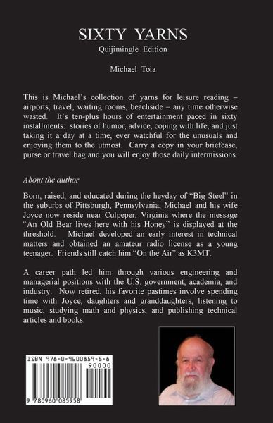This is Michael's collection of yarns for leisure reading - airports, travel, waiting rooms, beachside - any time otherwise wasted. It's ten-plus hours of entertainment paced in sixty installments: stories of humor, advice, coping with life, and just taking it a day at a time, ever watchful for the unusuals and enjoying them to the utmost. Carry a copy in your briefcase, purse or travel bag and you will enjoy those daily intermissions.