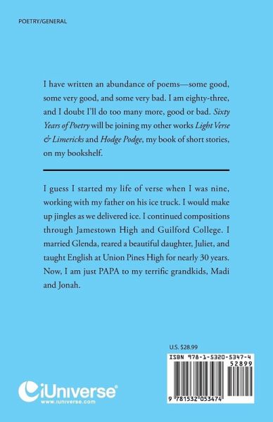 I have written an abundance of poemssome good, some very good, and some very bad. I am eighty-three, and I doubt Ill do too many more, good or bad. Sixty Years of Poetry will be joining my other works Light Verse & Limericks and Hodge Podge, my book of short stories, on my bookshelf.