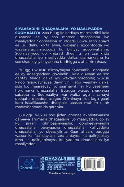SIYAASADIHII DHAQAALAHA IYO MAALIYADDA SOOMAALIYA waa buug ka hadlaya marxaladihii kala duwanaa ee ay soo mareen dhaqaalaha iyo maaliyadda Soomaaliya muddadii 63-ka sano ahayd ee uu dalku xorta ahaa, waxaana aqoontooda iyo waaya-aragnimadooda ku biiriyay aqoonyahanno Soomaaliyeed oo khibrad dheer u leh taariikhda dhaqaalaha iyo maaliyadda dalka, islamarkaana ka soo shaqeeyay hay'adaha budhigga u ah arrimahaas. Buuggu wuxuu qiimaynayaa siyaasadihii dhaqaale ee ay adeegsadeen dowladihii kala duwaan ee soo qabtay talada dalka iyo waxtarnimadoodii; wuxuu kaloo falanqaynayaa daymiyihii lagu yeeshay dalka, sidii loo maareeyay iyo saamayntii ay ku yeesheen horumarka dhaqaalaha. Buuggu wuxuu sharxayaa sababta ay Soomaaliya mar walba ugu tiirsanayd deeqaha dibadda, asagoo iftiiminaya sida lagu gaari karo iskufillaaasho dhaqaale, kaasoo muhiim u ah madaxbannaanida qaranka. Buuggu wuxuu soo jiidan doonaa akhristayaasha daneeya arrimaha dhaqaalaha iyo maaliyadda, oo ay ku jiraan cilmibaarayaasha, qorsheeyayaasha dhaqaalaha, barayaasha dhaqaalaha, kulliyadaha dhaqaalaha iyo siyaasiyiinta. Gaar ahaan, buugga waxaa ka faa'iidaysan kara ardayda ka qalinjebisay ama ka qalinjebinaysa kulliyadaha dhaqaalaha iyo maaliyadda.