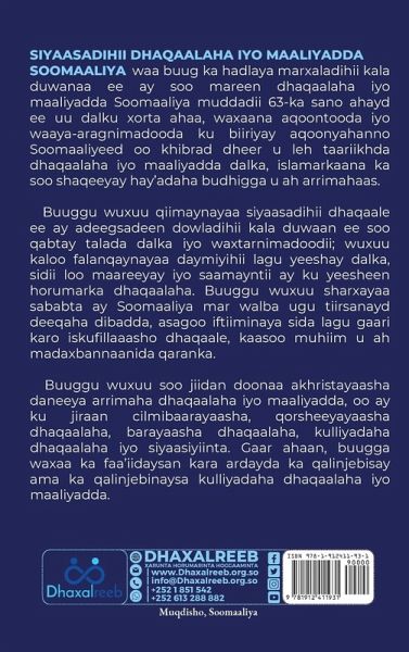 SIYAASADIHII DHAQAALAHA IYO MAALIYADDA SOOMAALIYA waa buug ka hadlaya marxaladihii kala duwanaa ee ay soo mareen dhaqaalaha iyo maaliyadda Soomaaliya muddadii 63-ka sano ahayd ee uu dalku xorta ahaa, waxaana aqoontooda iyo waaya-aragnimadooda ku biiriyay aqoonyahanno Soomaaliyeed oo khibrad dheer u leh taariikhda dhaqaalaha iyo maaliyadda dalka, islamarkaana ka soo shaqeeyay hay'adaha budhigga u ah arrimahaas. Buuggu wuxuu qiimaynayaa siyaasadihii dhaqaale ee ay adeegsadeen dowladihii kala duwaan ee soo qabtay talada dalka iyo waxtarnimadoodii; wuxuu kaloo falanqaynayaa daymiyihii lagu yeeshay dalka, sidii loo maareeyay iyo saamayntii ay ku yeesheen horumarka dhaqaalaha. Buuggu wuxuu sharxayaa sababta ay Soomaaliya mar walba ugu tiirsanayd deeqaha dibadda, asagoo iftiiminaya sida lagu gaari karo iskufillaaasho dhaqaale, kaasoo muhiim u ah madaxbannaanida qaranka. Buuggu wuxuu soo jiidan doonaa akhristayaasha daneeya arrimaha dhaqaalaha iyo maaliyadda, oo ay ku jiraan cilmibaarayaasha, qorsheeyayaasha dhaqaalaha, barayaasha dhaqaalaha, kulliyadaha dhaqaalaha iyo siyaasiyiinta. Gaar ahaan, buugga waxaa ka faa'iidaysan kara ardayda ka qalinjebisay ama ka qalinjebinaysa kulliyadaha dhaqaalaha iyo maaliyadda.