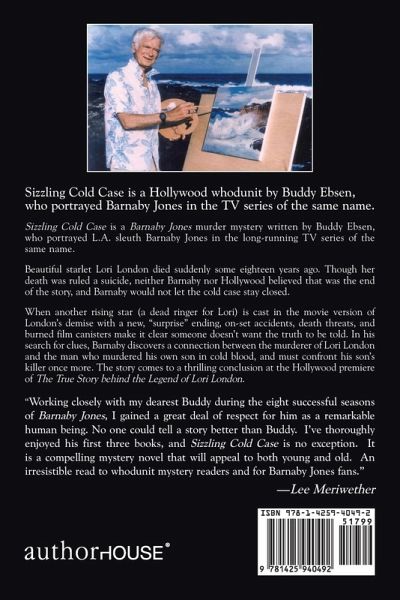 Sizzling Cold Case is a Barnaby Jones murder mystery written by Buddy Ebsen, who portrayed L.A. sleuth Barnaby Jones in the long-running TV series of the same name. Beautiful starlet Lori London died suddenly some eighteen years ago. Though her death was ruled a suicide, neither Barnaby nor Hollywood believed that was the end of the story, and Barnaby would not let the cold case stay closed. When another rising star (a dead ringer for Lori) is cast in the movie version of London’s demise with a new, "surprise" ending, on-set accidents, death threats, and burned film canisters make it clear someone doesn’t want the truth to be told. In his search for clues, Barnaby discovers a connection between the murderer of Lori London and the man who murdered his own son in cold blood, and must confront his son’s killer once more. The story comes to a thrilling conclusion at the Hollywood premiere of The True Story behind the Legend of Lori London.