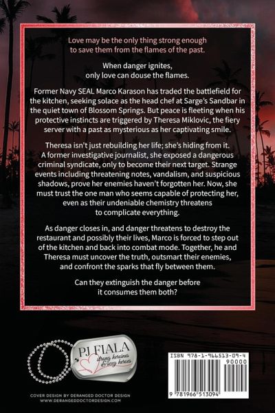 Love may be the only thing strong enough to save them from the flames of the past. When danger ignites, only love can douse the flames. Former Navy SEAL Marco Karason has traded the battlefield for the kitchen, seeking solace as the head chef at Sarge's Sandbar in the quiet town of Blossom Springs. But peace is fleeting when his protective instincts are triggered by Theresa Miklovic, the fiery server with a past as mysterious as her captivating smile. Theresa isn't just rebuilding her life; she's hiding from it. A former investigative journalist, she exposed a dangerous criminal syndicate, only to become their next target. Strange events including threatening notes, vandalism, and suspicious shadows, prove her enemies haven't forgotten her. Now, she must trust the one man who seems capable of protecting her, even as their undeniable chemistry threatens to complicate everything. As danger closes in, and danger threatens to destroy the restaurant and possibly their lives, Marco is forced to step out of the kitchen and back into combat mode. Together, he and Theresa must uncover the truth, outsmart their enemies, and confront the sparks that fly between them. Can they extinguish the danger before it consumes them both? Sizzling Nights is a steamy, small-town romantic suspense that blends passion, danger, and redemption. USA Today bestselling author PJ Fiala delivers a heart-pounding story of love that burns as bright as the flames threatening to destroy it all.