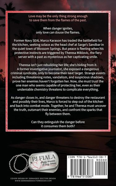 Love may be the only thing strong enough to save them from the flames of the past. When danger ignites, only love can douse the flames. Former Navy SEAL Marco Karason has traded the battlefield for the kitchen, seeking solace as the head chef at Sarge's Sandbar in the quiet town of Blossom Springs. But peace is fleeting when his protective instincts are triggered by Theresa Miklovic, the fiery server with a past as mysterious as her captivating smile. Theresa isn't just rebuilding her life; she's hiding from it. A former investigative journalist, she exposed a dangerous criminal syndicate, only to become their next target. Strange events including threatening notes, vandalism, and suspicious shadows, prove her enemies haven't forgotten her. Now, she must trust the one man who seems capable of protecting her, even as their undeniable chemistry threatens to complicate everything. As danger closes in, and danger threatens to destroy the restaurant and possibly their lives, Marco is forced to step out of the kitchen and back into combat mode. Together, he and Theresa must uncover the truth, outsmart their enemies, and confront the sparks that fly between them. Can they extinguish the danger before it consumes them both? Sizzling Nights is a steamy, small-town romantic suspense that blends passion, danger, and redemption. USA Today bestselling author PJ Fiala delivers a heart-pounding story of love that burns as bright as the flames threatening to destroy it all.