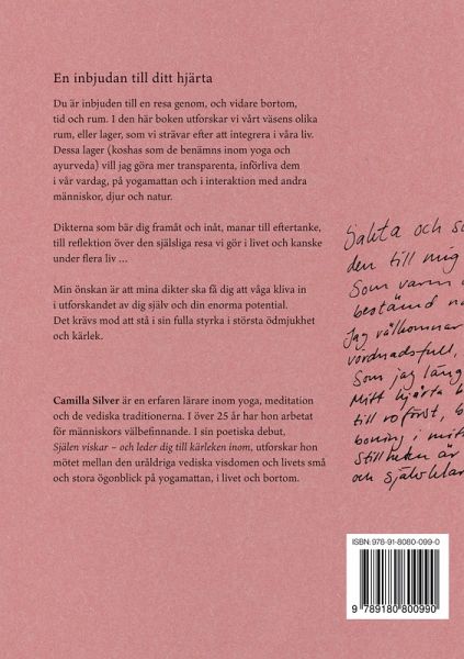 En inbjudan till ditt hjärta Du är inbjuden till en resa genom, och vidare bortom, tid och rum. I den här boken utforskar vi vårt väsens olika rum, eller lager, som vi strävar efter att integrera i våra liv. Dessa lager (koshas som de benämns inom yoga och ayurveda) vill jag göra mer transparenta, införliva dem i vår vardag, på yogamattan och i interaktion med andra människor, djur och natur. Dikterna som bär dig framåt och inåt, manar till eftertanke, till reflektion över den själsliga resa vi gör i livet och kanske under flera liv. Min önskan är att mina dikter ska få dig att våga kliva in i utforskandet av dig själv och din enorma potential. Det krävs mod att stå i sin fulla styrka i största ödmjukhet och kärlek.
