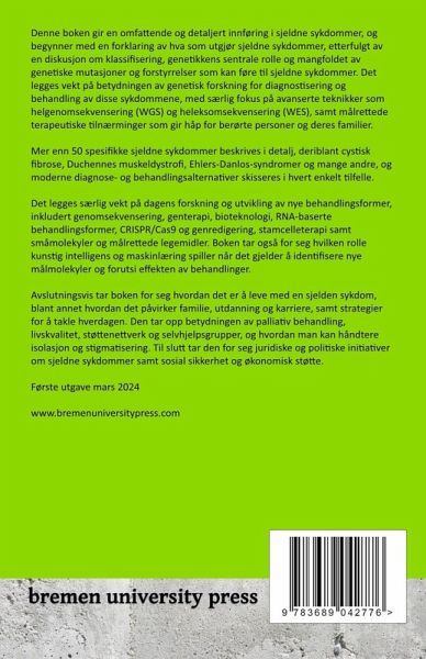 Denne boken gir en omfattende og detaljert innføring i sjeldne sykdommer, og begynner med en forklaring av hva som utgjør sjeldne sykdommer, etterfulgt av en diskusjon om klassifisering, genetikkens sentrale rolle og mangfoldet av genetiske mutasjoner og forstyrrelser som kan føre til sjeldne sykdommer. Det legges vekt på betydningen av genetisk forskning for diagnostisering og behandling av disse sykdommene, med særlig fokus på avanserte teknikker som helgenomsekvensering (WGS) og heleksomsekvensering (WES), samt målrettede terapeutiske tilnærminger som gir håp for berørte personer og deres familier. Mer enn 50 spesifikke sjeldne sykdommer beskrives i detalj, deriblant cystisk fibrose, Duchennes muskeldystrofi, Ehlers-Danlos-syndromer og mange andre, og moderne diagnose- og behandlingsalternativer skisseres i hvert enkelt tilfelle. Det legges særlig vekt på dagens forskning og utvikling av nye behandlingsformer, inkludert genomsekvensering, genterapi, bioteknologi, RNA-baserte behandlingsformer, CRISPR/Cas9 og genredigering, stamcelleterapi samt småmolekyler og målrettede legemidler. Boken tar også for seg hvilken rolle kunstig intelligens og maskinlæring spiller når det gjelder å identifisere nye målmolekyler og forutsi effekten av behandlinger. Avslutningsvis tar boken for seg hvordan det er å leve med en sjelden sykdom, blant annet hvordan det påvirker familie, utdanning og karriere, samt strategier for å takle hverdagen. Den tar opp betydningen av palliativ behandling, livskvalitet, støttenettverk og selvhjelpsgrupper, og hvordan man kan håndtere isolasjon og stigmatisering. Til slutt tar den for seg juridiske og politiske initiativer om sjeldne sykdommer samt sosial sikkerhet og økonomisk støtte.