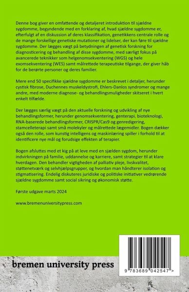 Denne bog giver en omfattende og detaljeret introduktion til sjældne sygdomme, begyndende med en forklaring af, hvad sjældne sygdomme er, efterfulgt af en diskussion af deres klassifikation, genetikkens centrale rolle og de mange forskellige genetiske mutationer og lidelser, der kan føre til sjældne sygdomme. Der lægges vægt på betydningen af genetisk forskning for diagnosticering og behandling af disse sygdomme, med særligt fokus på avancerede teknikker som helgenomsekventering (WGS) og hele exomsekventering (WES) samt målrettede terapeutiske tilgange, der giver håb for de berørte personer og deres familier. Mere end 50 specifikke sjældne sygdomme er beskrevet i detaljer, herunder cystisk fibrose, Duchennes muskeldystrofi, Ehlers-Danlos syndromer og mange andre, med moderne diagnose- og behandlingsmuligheder skitseret i hvert enkelt tilfælde. Der lægges særlig vægt på den aktuelle forskning og udvikling af nye behandlingsformer, herunder genomsekventering, genterapi, bioteknologi, RNA-baserede behandlingsformer, CRISPR/Cas9 og genredigering, stamcelleterapi samt små molekyler og målrettede lægemidler. Bogen dækker også den rolle, som kunstig intelligens og maskinlæring spiller i forhold til at identificere nye mål og forudsige effekten af terapier. Bogen afsluttes med et kig på at leve med en sjælden sygdom, herunder indvirkningen på familie, uddannelse og karriere, samt strategier til at klare hverdagen. Den behandler vigtigheden af palliativ pleje, livskvalitet, støttenetværk og selvhjælpsgrupper, og hvordan man håndterer isolation og stigmatisering. Endelig diskuteres juridiske og politiske initiativer vedrørende sjældne sygdomme samt social sikring og økonomisk støtte.