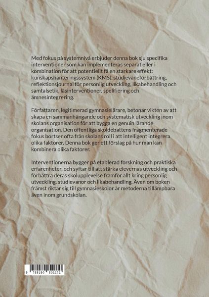 Med fokus på systemnivå erbjuder denna bok sju specifika interventioner som kan implementeras separat eller i kombination för att potentiellt få en starkare effekt: kunskapshanteringssystem (KMS), studievaneförbättring, reflektionsjournal för personlig utveckling, likabehandling och samtalsetik, läsinterventioner, spelifiering och ämnesintegrering. Författaren, legitimerad gymnasielärare, betonar vikten av att skapa en sammanhängande och systematisk utveckling inom skolans organisation för att bygga en genuin lärande organisation. Den offentliga skoldebattens fragmenterade fokus bortser ofta från skolans roll i att intelligent integrera olika faktorer. Denna bok ger ett förslag på hur man kan kombinera olika faktorer. Interventionerna bygger på etablerad forskning och praktiska erfarenheter, och syftar till att stärka elevernas utveckling och förbättra deras skolupplevelse framför allt kring personlig utveckling, studievanor och likabehandling. Även om boken främst riktar sig till gymnasieskolor är metoderna tillämpbara även inom grundskolan.