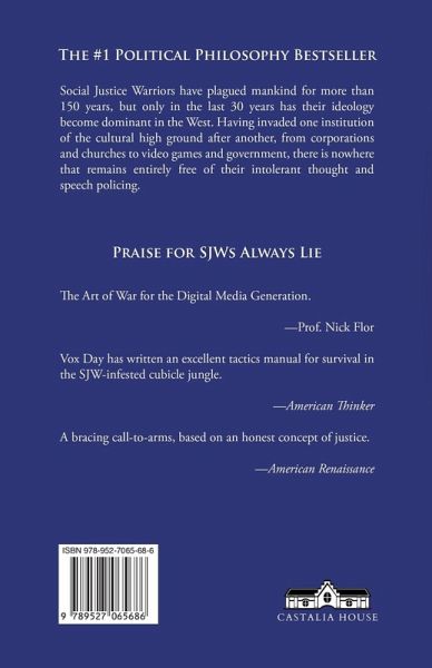 Social Justice Warriors have plagued mankind for more than 150 years, but only in the last 30 years has their ideology become dominant in the West. Having invaded one institution of the cultural high ground after another, from corporations and churches to video games and government, there is nowhere that remains entirely free of their intolerant thought and speech policing. Because the SJW agenda of diversity, tolerance, inclusiveness, and equality flies in the face of both science and observable reality, SJWs relentlessly work to prevent normal people from thinking or speaking in any manner that will violate their ever-mutating Narrative. They police science, philosophy, technology, and even history in order to maintain the pretense that their agenda remains inevitable in a modern world that contradicts it on a daily basis. The book is named after the First Law of SJW: SJWs always lie. SJWS ALWAYS LIE is a useful guide to understanding, anticipating, and surviving SJW attacks from the perspective of a man who has not only survived, but thrived, after experiencing multiple attempts by Social Justice Warriors to disqualify, discredit, and disemploy him in the same manner they have successfully attacked Nobel Laureates, technology CEOs, broadcasters, sports commentators, school principals, and policemen. It analyzes well-known SJW attacks as well as the two most successful examples of resistance to the SJW Narrative, #GamerGate and Sad Puppies. Written by Vox Day, Supreme Dark Lord of the Evil Legion of Evil and three-time Hugo nominee who is described as the most hated man in science fiction by Black Gate and The Wall Street Journal, SJWS ALWAYS LIE is a powerful weapon in the cultural war against the thought police.
