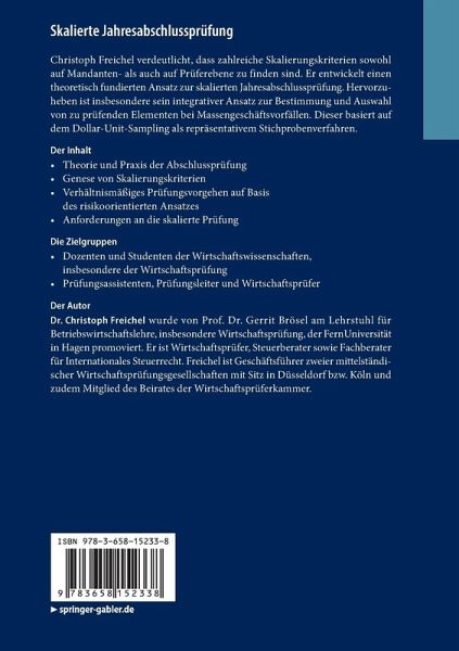 Christoph Freichel verdeutlicht, dass zahlreiche Skalierungskriterien sowohl auf Mandanten- als auch auf Prüferebene zu finden sind. Er entwickelt einen theoretisch fundierten Ansatz zur skalierten Jahresabschlussprüfung. Hervorzuheben ist insbesondere sein integrativer Ansatz zur Bestimmung und Auswahl von zu prüfenden Elementen bei Massengeschäftsvorfällen. Dieser basiert auf dem Dollar-Unit-Sampling als repräsentativem Stichprobenverfahren.