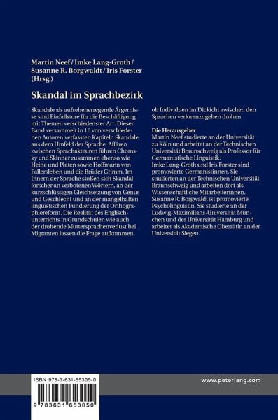 Skandale als aufsehenerregende Ärgernisse sind Einfallstore für die Beschäftigung mit Themen verschiedenster Art. Dieser Band versammelt in 16 von verschiedenen Autoren verfassten Kapiteln Skandale aus dem Umfeld der Sprache. Affären zwischen Sprachakteuren führen Chomsky und Skinner zusammen ebenso wie Heine und Platen sowie Hoffmann von Fallersleben und die Brüder Grimm. Im Innern der Sprache stoßen sich Skandalforscher an verbotenen Wörtern, an der kurzschlüssigen Gleichsetzung von Genus und Geschlecht und an der mangelhaften linguistischen Fundierung der Orthographiereform. Die Realität des Englischunterrichts in Grundschulen wie auch der drohende Muttersprachenverlust bei Migranten lassen die Frage aufkommen, ob Individuen im Dickicht zwischen den Sprachen verlorenzugehen drohen.