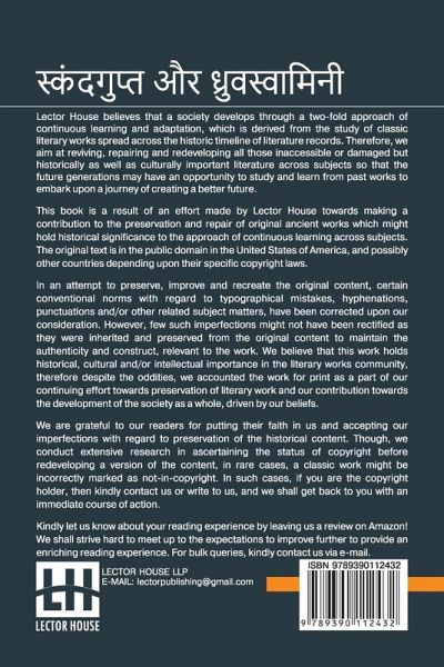 Skandgupt Aur Dhruvswamini This book is a result of an effort made by us towards making a contribution to the preservation and repair of original classic literature. In an attempt to preserve, improve and recreate the original content, we have worked towards: 1. Type-setting & Reformatting: The complete work has been re-designed via professional layout, formatting and type-setting tools to re-create the same edition with rich typography, graphics, high quality images, and table elements, giving our readers the feel of holding a 'fresh and newly' reprinted and/or revised edition, as opposed to other scanned & printed (Optical Character Recognition - OCR) reproductions. 2. Correction of imperfections: As the work was re-created from the scratch, therefore, it was vetted to rectify certain conventional norms with regard to typographical mistakes, hyphenations, punctuations, blurred images, missing content/pages, and/or other related subject matters, upon our consideration. Every attempt was made to rectify the imperfections related to omitted constructs in the original edition via other references. However, a few of such imperfections which could not be rectified due to intentional\unintentional omission of content in the original edition, were inherited and preserved from the original work to maintain the authenticity and construct, relevant to the work. We believe that this work holds historical, cultural and/or intellectual importance in the literary works community, therefore despite the oddities, we accounted the work for print as a part of our continuing effort towards preservation of literary work and our contribution towards the development of the society as a whole, driven by our beliefs. We are grateful to our readers for putting their faith in us and accepting our imperfections with regard to preservation of the historical content. HAPPY READING!