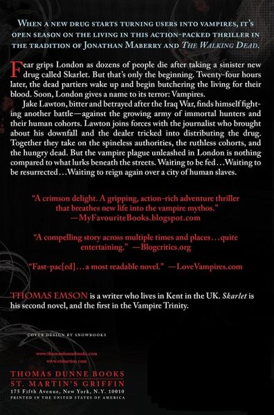 When a new drug starts turning users into vampires, it's open season on the living in this action-packed thriller in the tradition of Jonathan Maberry and The Walking Dead Fear grips London as dozens of people die after taking a sinister new drug called Skarlet. But that's only the beginning. Forty-eight hours later, the dead partiers wake up and begin butchering the living for their blood. Soon, London gives a name to its terror: Vampires. Jake Lawton, bitter and betrayed after the Iraq War, finds himself fighting another battle - against the growing army of immortal hunters and their human cohorts. Lawton joins forces with the journalist who brought about his downfall and the dealer tricked into distributing the drug. Together they take on the spineless authorities, the ruthless cohorts, and the hungry dead. But the vampire plague unleashed in London is nothing to what lurks beneath the streets. Waiting to be fed ...Waiting to be resurrected ...Waiting to reign again over a city of human slaves.