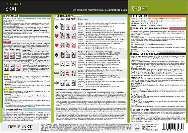 Erlernen auch Sie das beliebteste Kartenspiel im deutschsprachigen Raum: Skat! Mit vielen Beispielen und Abbildungen führt Sie diese zweiseitige Info-Tafel erst an die Grundlagen des Spiels und des Spielablaufs, um dann anhand von Musterabläufen Feinheiten und erste Taktiken zu erläutern. Die Faszination dieses Kartenspiels ist seit Generationen ungebrochen - erlernen Sie es noch heute! Die wasserfest laminierte Info-Tafel hält dabei auch starken Belastungen über Jahre hinweg stand und kann bei Bedarf sogar mit einem abwischbaren Overheadstift beschriftet werden (nicht im Lieferumfang enthalten).