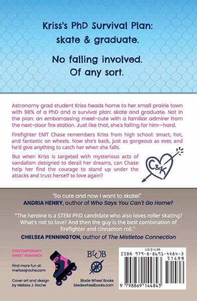 Astronomy grad student Kriss heads home to her small prairie town with 98% of a PhD and a survival plan: skate and graduate. Not in the plan: an embarrassing meet-cute with a familiar admirer from the next-door fire station. Just like that, she's falling for him-hard. Firefighter EMT Chase remembers Kriss from high school: smart, hot, and fantastic on wheels. Now she's back, just as gorgeous as ever, and he'd give anything to catch her when she falls. But when Kriss is targeted with mysterious acts of vandalism designed to derail her dreams, can Chase help her find the courage to stand up under the attacks and trust herself to love again?