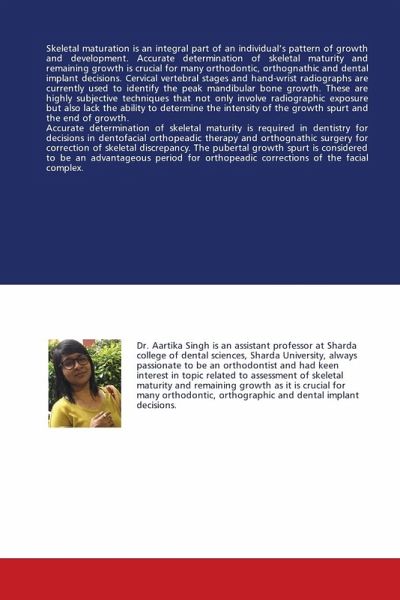 Skeletal maturation is an integral part of an individual's pattern of growth and development. Accurate determination of skeletal maturity and remaining growth is crucial for many orthodontic, orthognathic and dental implant decisions. Cervical vertebral stages and hand-wrist radiographs are currently used to identify the peak mandibular bone growth. These are highly subjective techniques that not only involve radiographic exposure but also lack the ability to determine the intensity of the growth spurt and the end of growth. Accurate determination of skeletal maturity is required in dentistry for decisions in dentofacial orthopeadic therapy and orthognathic surgery for correction of skeletal discrepancy. The pubertal growth spurt is considered to be an advantageous period for orthopeadic corrections of the facial complex.