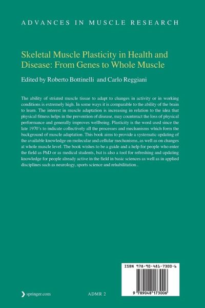 The ability of striated muscle tissue to adapt to changes in activity or in working conditions is extremely high. In some ways it is comparable to the ability of the brain to learn. The interest in muscle adaptation is increasing in relation to the idea that physical fitness helps in the prevention of disease, may counteract the loss of physical performance and generally improves wellbeing. Plasticity is the word used since the late 1970's to indicate collectively all the processes and mechanisms which form the background of muscle adaptation. This book aims to provide a systematic updating of the available knowledge on molecular and cellular mechanisms, as well as on changes at whole muscle level. The book means to be a guide and a help for people who enter the field as PhD or medical students, but is also a tool for refreshing and updating knowledge for people already active in the field in basic sciences as well as in applied disciplines such as neurology, sports science and rehabilitation.