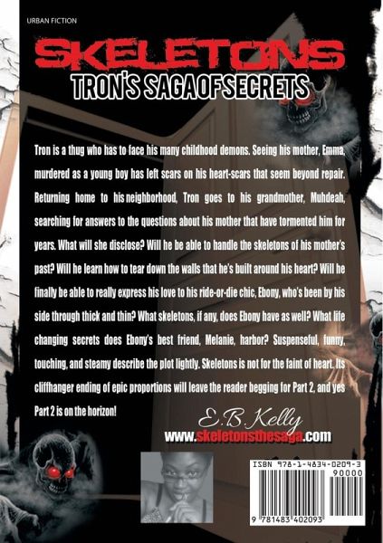 Tron is a street thug facing many childhood demons. Seeing his mother, Emma, murdered as a young boy has left seemingly irreparable scars on his heart. Nearly everyone is terrified of Tron, but not his girlfriend, Ebony. With a simple touch, she has the ability to tame the beast. Tron is on probation and has no desire to go back to jail. After he beats a man nearly to death, Tron begins to question events from his past and the reasons that he has become such a violent man. Knowing there is only one person who can help him, Tron leaves Ebony behind and returns home to seek out his grandmother, Muhdeah. As Tron deals with skeletons from his past and attempts to tear down his emotional walls, Ebony faces her own dilemma as her best friend confesses an attraction to her. Skeletons tells a fast-paced, urban tale of two vulnerable souls searching for identity, love, and happiness in the midst of a violent and drug-filled world.