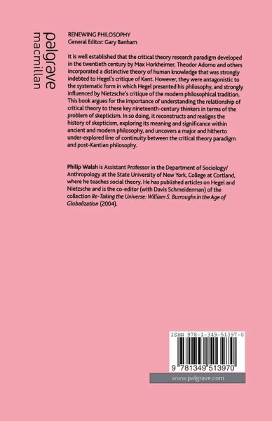 This book examines the issue of philosophical skepticism in the light of its relevance for the critique of modernity associated with the Frankfurt School. It situates the problem of skepticism in the context of the history of philosophy and explores its significance for the modern crisis of reason manifested in post-Kantian philosophy, which presaged the critical turn toward social theory.