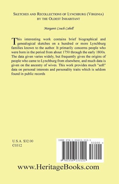 This interesting work contains brief biographical and genealogical sketches on a hundred or more Lynchburg families known to the author. It primarily concerns people who were born in the period from about 1750 through the early 1800s. The data given varies widely, but frequently gives the origins of people who came to Lynchburg from elsewhere, and much data is given on the ancestry of wives. This work provides much "soft" data on personal interests and personality traits which is seldom found in public records.