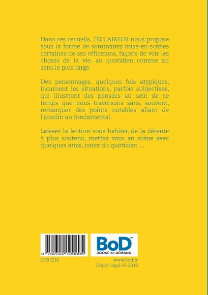 Dans ces recueils, l'ÉCLAIREUR nous propose sous la forme de sommaires mise-en-scènes certaines de ses réflexions, façons de voir les choses de la vie, au quotidien comme au sens le plus large. Des personnages, quelques fois atypiques, incarnent les situations, parfois subjectives, qui illustrent des pensées au sein de ce temps que nous traversons sans, souvent, remarquer des points notables allant de l'anodin au fondamental. Laissez la lecture vous habiter, de la détente à plus soutenu, mettez vous en scène avec quelques amis, jouez du quotidien ...