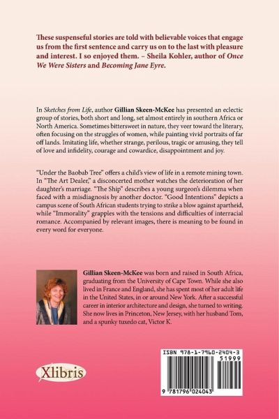 In Sketches from Life, author Gillian Skeen-McKee has presented an eclectic group of stories, both short and long, set almost entirely in southern Africa or North America. Sometimes bittersweet in nature, they veer toward the literary, often focusing on the struggles of women while painting vivid portraits of far-off lands. Imitating life, whether strange, perilous, tragic, or amusing, they tell of love and infidelity, courage and cowardice, disappointment and joy. "Under the Baobab Tree" offers a child's view of life in a remote mining town. In "The Art Dealer," a disconcerted mother watches the deterioration of her daughter's marriage. "The Ship" describes a young surgeon's dilemma when faced with a misdiagnosis by another doctor. "Good Intentions" depicts a campus scene of South African students trying to strike a blow against apartheid while "Immorality" grapples with the tensions and difficulties of interracial romance. Accompanied by relevant images, there is meaning to be found in every word for everyone.