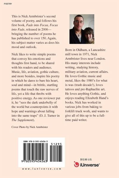 This is Nick Armbrister's second volume of poetry, and follows his first book, Fade into Focus, Focus into Fade, released in 2006-bringing the number of poems he has published to over 150. Again, his subject matter varies as does his mood and outlook. Nick likes to write simple poems that convey his emotions and thoughts first hand, to be shared with his readers and audience. Music, life, aviation, gothic culture, and more besides, inspire his poetry in which he dares to bare his heart, soul and mind-in brittle, startling poems that touch the raw nerves of life, yet a life that throbs with positive energy. As one reviewer put it, he "sees the dark underbelly of the world but counterpoints it with hope and warnings about falling into the same traps" (D. J. Turner in The Supplement).