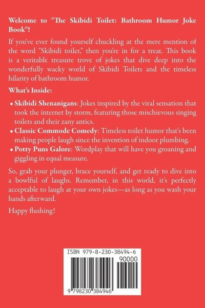 Welcome to "The Skibidi Toilet: Bathroom Humor Joke Book"! If you've ever found yourself chuckling at the mere mention of the word "Skibidi toilet," then you're in for a treat. This book is a veritable treasure trove of jokes that dive deep into the wonderfully wacky world of Skibidi Toilets and the timeless hilarity of bathroom humor. What's Inside:Skibidi Shenanigans: Jokes inspired by the viral sensation that took the internet by storm, featuring those mischievous singing toilets and their zany antics. Classic Commode Comedy: Timeless toilet humor that's been making people laugh since the invention of indoor plumbing. Potty Puns Galore: Wordplay that will have you groaning and giggling in equal measure. So, grab your plunger, brace yourself, and get ready to dive into a bowlful of laughs. Remember, in this world, it's perfectly acceptable to laugh at your own jokes-as long as you wash your hands afterward. Happy flushing!