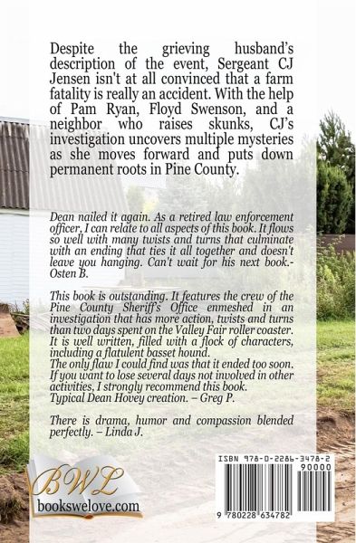 Despite the grieving husband's description of the event, Sergeant CJ Jensen isn't at all convinced that a farm fatality is really an accident. With the help of Pam Ryan, Floyd Swenson, and a neighbor who raises skunks, CJ's investigation uncovers multiple mysteries as she moves forward and puts down permanent roots in Pine County. Review Snippets: Dean nailed it again. As a retired law enforcement officer, I can relate to all aspects of this book. It flows so well with many twists and turns that culminate with an ending that ties it all together and doesn't leave you hanging. Can't wait for his next book.- Osten B. This book is outstanding. It features the crew of the Pine County Sheriff's Office enmeshed in an investigation that has more action, twists and turns than two days spent on the Valley Fair roller coaster. It is well written, filled with a flock of characters, including a flatulent basset hound. The only flaw I could find was that it ended too soon. If you want to lose several days not involved in other activities, I strongly recommend this book. Typical Dean Hovey creation. - Greg P. There is drama, humor and compassion blended perfectly. - Linda J. I don't know how you keep coming up with these great tales, they're intriguing, scary, funny and hold my attention... Can't wait for another story in Pine County. -Kathy W-B