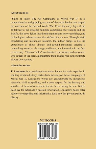 "Skies of Valor: The Air Campaigns of World War II" is a comprehensive and gripping account of the aerial battles that shaped the outcome of the Second World War. From the early days of the Blitzkrieg to the strategic bombing campaigns over Europe and the Pacific, this book delves into the daring missions, heroic sacrifices, and technological advancements that defined the air war. Through vivid storytelling and meticulous research, the author brings to life the experiences of pilots, aircrew, and ground personnel, offering a compelling narrative of courage, resilience, and innovation in the face of adversity. "Skies of Valor" is a tribute to the airmen and airwomen who fought in the skies, highlighting their crucial role in the ultimate victory over tyranny.