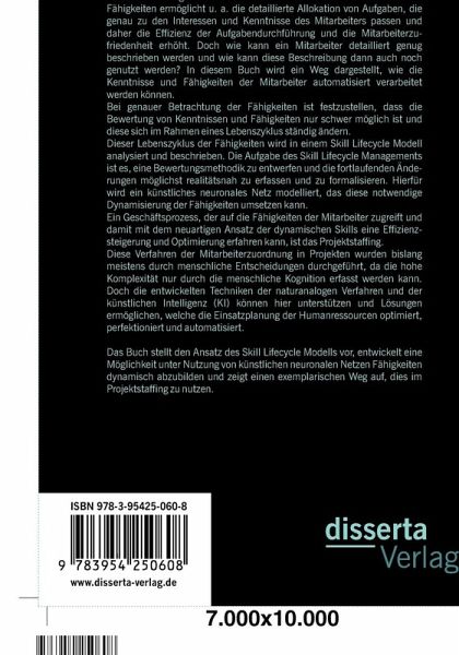 Das Buch stellt den Ansatz des Skill Lifecycle Modells vor, entwickelt eine Möglichkeit unter Nutzung von künstlichen neuronalen Netzen Fähigkeiten dynamisch abzubilden und zeigt einen exemplarischen Weg auf, dies im Projektstaffing zu nutzen.