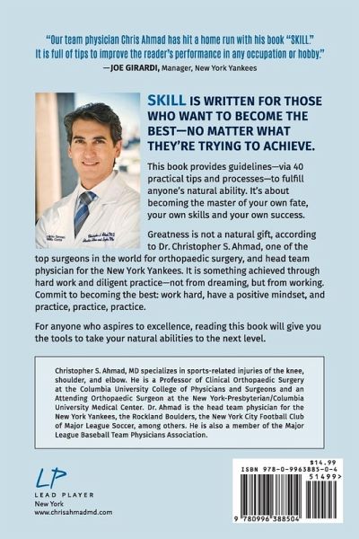 SKILL is written for those who want to become the best - no matter what they're trying to achieve. This book provides guidelines - via 40 practical tips and processes - to fulfill anyone's natural ability. It's about becoming the master of your own fate, your own skills and your own success. Greatness is not a natural gift, according to Dr. Christopher S. Ahmad, one of the top surgeons in the world for orthopaedic surgery, and head team physician for the New York Yankees. It is something achieved through hard work and diligent practice - not from dreaming, but from working. Master chef, great soccer player, brilliant musician, doctor, lawyer, business executive: for anyone who aspires to excellence, reading this book will give you the tools to take your natural abilities to the next level.