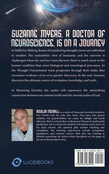 Suzanne Myers, a doctor of neuroscience, is on a journey to fulfill her lifelong dream of transferring thoughts from one individual to another. Her naturalistic view of humanity and the universe is challenged when she and her team discover there is much more to the human condition than mere biological and neurological processes. As the Thought Transmission team progresses through their study, they encounter evidence of an even greater discovery. In the end, Suzanne discovers the ultimate source of revelation, knowledge, and truth. In Skimming Eternity, the reader will experience the astonishing connection between our natural world and the eternal realm of God.