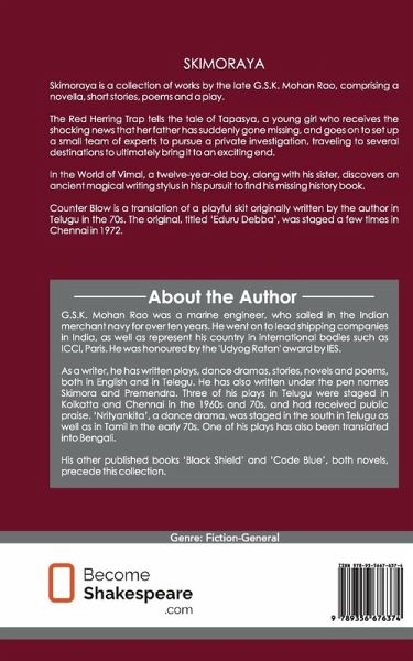 Skimoraya is a collection of works by the late G.S.K. Mohan Rao, comprising short stories, poems and a play. The Red Herring Trap tells the tale of Tapasya, a young girl who receives the shocking news that her father has suddenly gone missing, and goes on to set up a small team of experts to pursue a private investigation, traveling to several destinations to ultimately bring it to an exciting end. Portals of Hope is set in colonial India during the time of the second world war. The story begins with a group of four Jewish gentlemen exploring setting up businesses in India. Their sudden disappearance on the eve of unveiling their first industrial complex gives rise to a mystery that remains unsolved. An Englishman, formerly a civil servant, continues to pursue the investigation despite his own physical disability and the lapse of time. Along with a team comprising his nephew, two Indian marine professionals and others, he goes on to help solve the mystery. The World of Vimal is a tale about Vimal, a young boy of 12 years, who along with his sister, discovers an ancient magical writing stylus in his pursuit to find his missing history book. Counter Blow is a translation of a playful skit originally written by the author in Telegu in the 70s. The original, titled 'Eduru Debba', was staged a few times in Chennai in 1972.