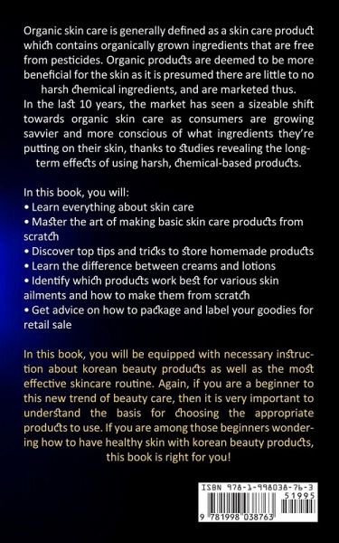 Organic skin care is generally defined as a skin care product which contains organically grown ingredients that are free from pesticides. Organic products are deemed to be more beneficial for the skin as it is presumed there are little to no harsh chemical ingredients, and are marketed thus. In the last 10 years, the market has seen a sizeable shift towards organic skin care as consumers are growing savvier and more conscious of what ingredients they're putting on their skin, thanks to studies revealing the long-term effects of using harsh, chemical-based products. In this book, you will: * Learn everything about skin care * Master the art of making basic skin care products from scratch * Discover top tips and tricks to store homemade products * Learn the difference between creams and lotions * Identify which products work best for various skin ailments and how to make them from scratch * Get advice on how to package and label your goodies for retail sale In this book, you will be equipped with necessary instruction about korean beauty products as well as the most effective skincare routine. Again, if you are a beginner to this new trend of beauty care, then it is very important to understand the basis for choosing the appropriate products to use. If you are among those beginners wondering how to have healthy skin with korean beauty products, this book is right for you!