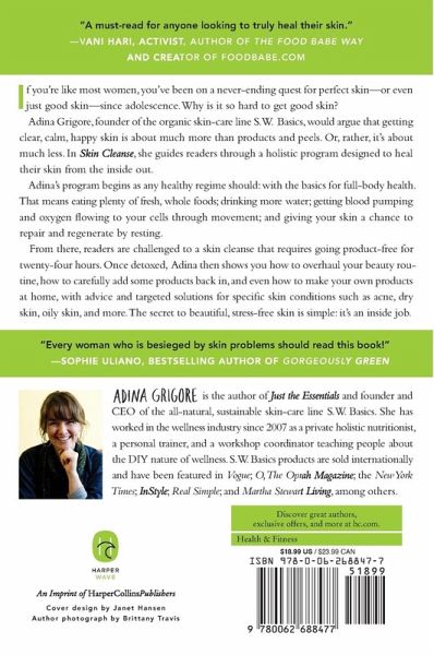 If you're like most women, you've been on a never-ending quest for perfect skin?or even just good skin?since adolescence. Why is it so hard to get good skin? Adina Grigore, founder of the organic skin-care line S.W. Basics, would argue that getting clear, calm, happy skin is about much more than products and peels. Or, rather, it's about much less. In Skin Cleanse, she guides readers through a holistic program designed to heal their skin from the inside out. Adina's program begins as any healthy regime should: with the basics for full-body health. That means eating plenty of fresh, whole foods; drinking more water; getting blood pumping and oxygen flowing to your cells through movement; and giving your skin a chance to repair and regenerate by resting. From there, readers are challenged to a skin cleanse that requires going product-free for twenty-four hours. Once detoxed, Adina then shows you how to overhaul your beauty routine, how to carefully add some products back in, and even how to make your own products at home, with advice and targeted solutions for specific skin conditions such as acne, dry skin, oily skin, and more. The secret to beautiful, stress-free skin is simple: it's an inside job.