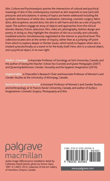 An interdisciplinary study of skin bridging cultural and psychoanalytic theory to consider how the body's "exterior" is central to human subjectivity and relations. The authors explore racialization, body modification, self-harm, and comedic representations of skin, drawing from the clinical domain, visual arts, popular culture, and literature.