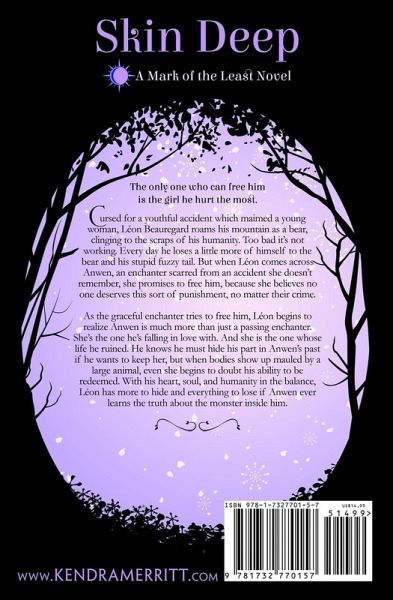 The only one who can free him is the girl he’s hurt the most. Cursed for a youthful accident which maimed a young woman, Léon Beauregard roams his mountain as a bear, clinging to the scraps of his humanity. Too bad it’s not working. Every day he loses a little more of himself to the bear and his stupid fuzzy tail. But when Léon comes across Anwen, an enchanter scarred from an accident she doesn’t remember, she promises to free him, because she believes no one deserves this sort of punishment, no matter their crime. As the graceful enchanter tries to free him, Léon begins to realize Anwen is much more than just a passing enchanter. She’s the one he’s falling in love with. And she is the one whose life he ruined. He knows he must hide his part in Anwen’s past if he wants to keep her, but when bodies show up mauled by a large animal, even she begins to doubt his ability to be redeemed. With his heart, soul, and humanity in the balance, Léon has more to hide and everything to lose if Anwen ever learns the truth about the monster inside him.