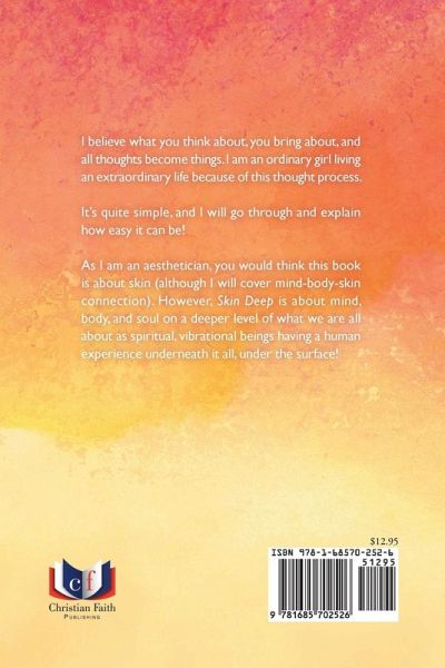 I believe what you think about, you bring about, and all thoughts become things. I am an ordinary girl living an extraordinary life because of this thought process. It's quite simple, and I will go through and explain how easy it can be! As I am an aesthetician, you would think this book is about skin (although I will cover mind-body-skin connection). However, Skin Deep is about mind, body, and soul on a deeper level of what we are all about as spiritual, vibrational beings having a human experience underneath it all, under the surface!