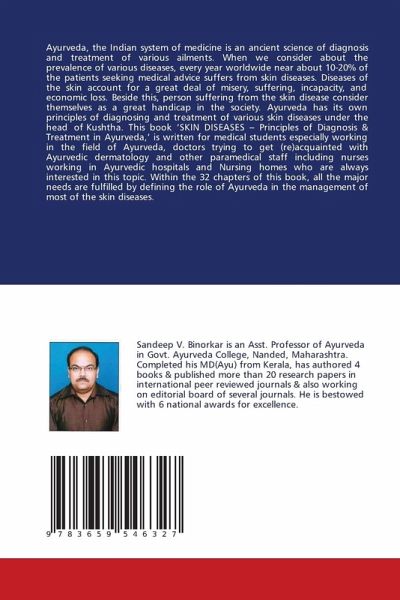 Ayurveda, the Indian system of medicine is an ancient science of diagnosis and treatment of various ailments. When we consider about the prevalence of various diseases, every year worldwide near about 10-20% of the patients seeking medical advice suffers from skin diseases. Diseases of the skin account for a great deal of misery, suffering, incapacity, and economic loss. Beside this, person suffering from the skin disease consider themselves as a great handicap in the society. Ayurveda has its own principles of diagnosing and treatment of various skin diseases under the head of Kushtha. This book 'SKIN DISEASES - Principles of Diagnosis & Treatment in Ayurveda,' is written for medical students especially working in the field of Ayurveda, doctors trying to get (re)acquainted with Ayurvedic dermatology and other paramedical staff including nurses working in Ayurvedic hospitals and Nursing homes who are always interested in this topic. Within the 32 chapters of this book, all the major needs are fulfilled by defining the role of Ayurveda in the management of most of the skin diseases.