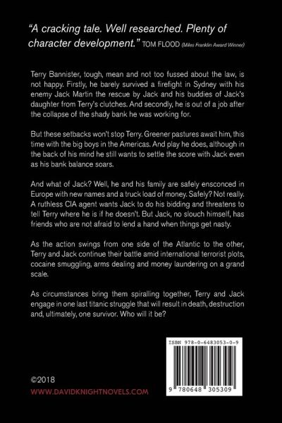 Terry Bannister, tough, mean and not too fussed about the law, is not happy. Firstly, he barely survived a firefight in Sydney with his enemy Jack Martin the rescue by Jack and his buddies of Jack’s daughter from Terry’s clutches. And secondly, he is out of a job after the collapse of the shady bank he was working for. But these setbacks won’t stop Terry. Greener pastures await him, this time with the big boys in the Americas. And play he does, although in the back of his mind he still wants to settle the score with Jack even as his bank balance soars. And what of Jack? Well, he and his family are safely ensconced in Europe with new names and a truck load of money. Safely? Not really. A ruthless CIA agent wants Jack to do his bidding and threatens to tell Terry where he is if he doesn’t. But Jack, no slouch himself, has friends who are not afraid to lend a hand when things get nasty. As the action swings from one side of the Atlantic to the other, Terry and Jack continue their battle amid international terrorist plots, cocaine smuggling, arms dealing and money laundering on a grand scale. As circumstances bring them spiralling together, Terry and Jack engage in one last titanic struggle that will result in death, destruction and, ultimately, one survivor. Who will it be?