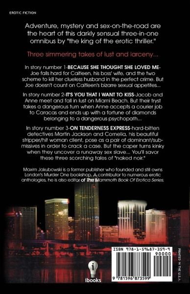 Skin in Darkness contains three scorching tales of naked noir, of lust and larceny. In It's You That I Want to Kiss--Jacob and Anne meet and fall in lust on Miami Beach. But their tryst takes a dangerous turn when Anne accepts a courier job to Caracas and ends up with a fortune of diamonds belonging to a dangerous psychopath. The second story follows Joe. He falls hard for Caitleen, his boss' wife, and the two scheme to kill her clueless husband in the perfect crime. But Joe doesn't count on Caitleen's bizarre sexual appetites. On Tenderness Express, hard-bitten detective Martin Jackson and Cornelia, his beautiful stripper and hit-woman client, pose as a pair of dominant-submissives in order to crack a case. But the caper turns kinky when they uncover a runaway sex slave.