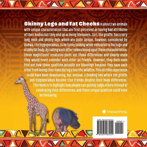 Skinny Legs and Fat Cheeks is about two animals with unique characteristics that are first perceived as having bad attributes of their bodies but they end up as being lifesavers. Zuri, the giraffe, has a very long neck and skinny legs which are quite unique, however, considered by Kubwa, the hippopotamus, to be funny looking when compared to his huge and stubby fat body. By calling each other names based upon these characteristics, these magnificent creatures point out these differences and clearly state they would never consider each other as friends. However, they both soon find out how those qualities actually are blessings because they save each other from losing their lives during a horrific wildfire. This terrible experience could have been devastating, but instead, a bonding one where the giraffe and hippopotamus become true friends despite their body differences. This book is to highlight how people can quickly judge others instead of celebrating their differences; and those unique qualities could even be lifesaving.