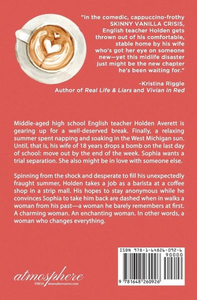Middle-aged high school English teacher Holden Averett is gearing up for a well-deserved break. Finally, a relaxing summer spent napping and soaking in the West Michigan sun. Until, that is, his wife of 18 years drops a bomb on the last day of school: move out by the end of the week. Sophia wants a trial separation. She also might be in love with someone else. Spinning from the shock and desperate to fill his unexpectedly fraught summer, Holden takes a job as a barista at a coffee shop in a strip mall. His hopes to stay anonymous while he convinces Sophia to take him back are dashed when in walks a woman from his past—a woman he barely remembers at first. A charming woman. An enchanting woman. In other words, a woman who changes everything. ___________________________________________________________________ "In the comedic, cappuccino-frothy SKINNY VANILLA CRISIS, English teacher Holden gets thrown out of his comfortable, stable home by his wife who's got her eye on someone new--yet this midlife disaster just might be the new chapter he's been waiting for." ~Kristina Riggle Author of Real Life & Liars and Vivian in Red USA Today bestselling author "Holden Averett's summer misadventures in Skinny Vanilla Crisis are both hilarious and heartbreaking. Despite Holden's missteps and dreamy middle-aged ennui, you can't help but root for his honest, espresso-fueled journey to self-awareness, culminating in a surprising and satisfying redemption. Best if read with a good cup of coffee!" ~E.A. Quinn Author of The Billionaire’s Bodyguard