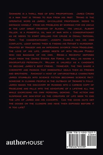 Skinware is a thrill ride of epic proportions. Jared Cross is a man that is trying to run from his past. Trying is the operative word as Jared, ex-college professor, seeks to distance himself from his problems by working for his uncle in the last great frontier of Alaska. His uncle, Albert Hiller, is a powerful oil man at war with a conservationist as he seeks to start drilling for crude in Denali National Park. The conservationist, Joseph Daniels has his own conflicts, least among them is finding his Father's murderer. Haunted by tragedy and an impending divorce from Madeleine, the love of his life, Jared meets up with William Posely who has baggage of his own. Being a recently deposed pilot from the United States Air Force, as well as having a disgruntled personality, William is unlikely as a candidate to become Jared's best friend. However, the two share a chemistry and passion that immediately seals them as friends and brothers. Amongst a host of unforgettable characters Jared stumbles into science fiction becoming science fact: someone is cloning people in the outback of Seward's folly. Jared makes the discovery by running into a carbon copy of Madeleine and falls into the adventure of a lifetime all the while exorcising his own personal demons. The action and suspense are non-stop as the creators of life seek to end the life of Jared and his cohorts. Can the good guys get the goods on the cloners and have them exposed before it is too late?