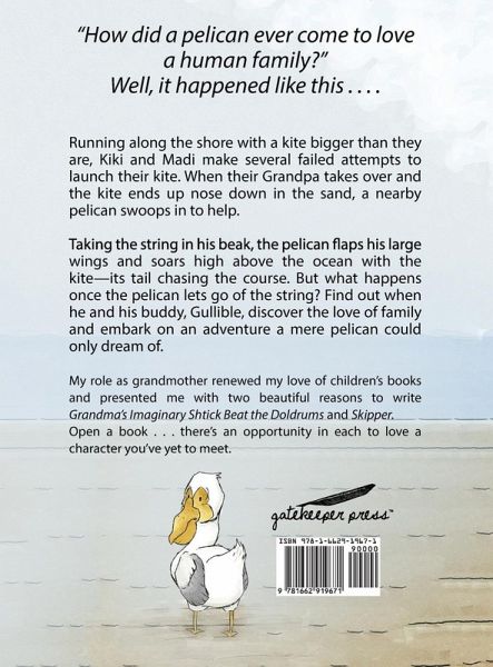 Running along the shore with a kite bigger than they are, Kiki and Madi make several failed attempts to launch their kite. When their Grandpa takes over and the kite ends up nose down in the sand, a nearby pelican swoops in to help. Taking the string in his beak, the pelican flaps his large wings and soars high above the ocean with the kite-its tail chasing the course. But what happens once the pelican lets go of the string? Find out when he and his buddy, Gullible, discover the love of family and embark on an adventure a mere pelican could only dream of . . . .
